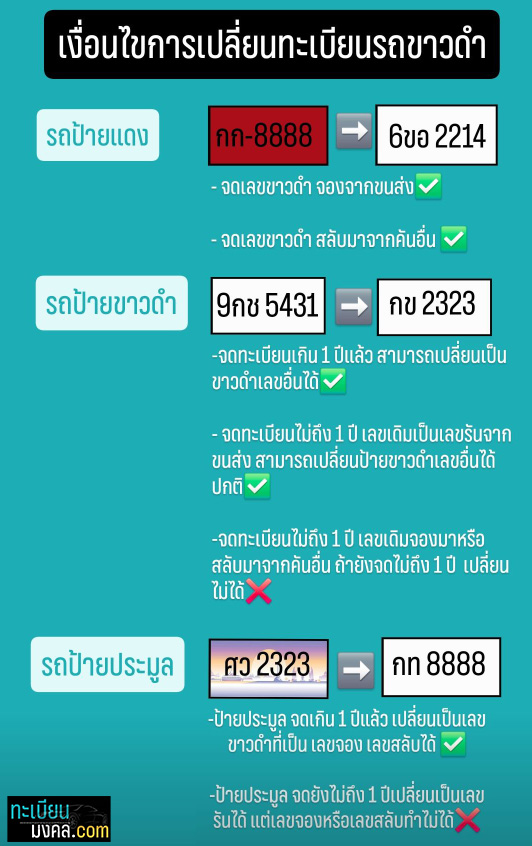 - ป้ายขาวจดทะเบียนไม่ถึง 1 ปี ถ้าเลขเดิมเป็นเลขจองหรือสลับมาจากคันอื่น : ถ้ายังจดไม่ถึง 1 ปี ไม่สามารถเปลี่ยนเป็นขาวดำเลขอื่นได้ทุกกรณี